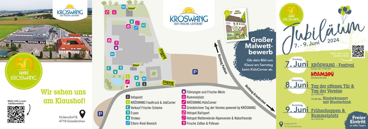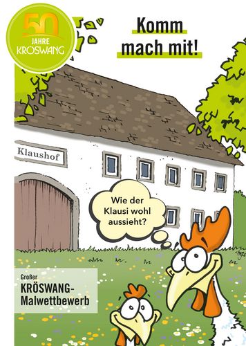Lass deine Kinder Klausi vom Klaushof malen und bringt die Zeichnung am Samstag, 8. Juni 2024 zum Tag der offenen Tür der Firma KRÖSWANG. Für die Abgabe der Zeichnung gibts beim KidsCorner 2 Jetons für den Rummelplatz und einen Gutschein für ein Gratis-Eis.