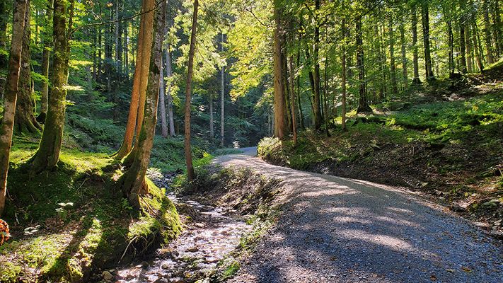 Wer der Alm einen Besuch abstatten will, darf vorher 45 Minuten lang durch prachtvolle Bergwälder schlendern.