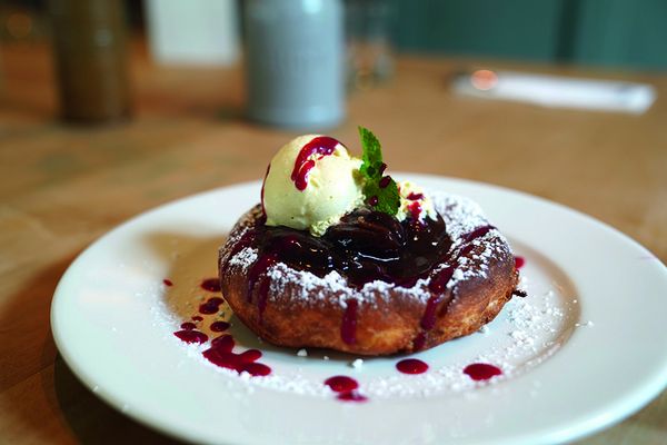 Das Faasekichelche ist ein handgezogener Hefekrapfen mit Zwetschkenröster und Vanilleeis.