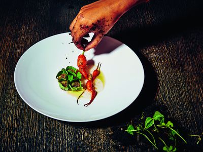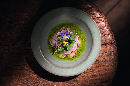 Unsere Küche ist sehr stark von der Natur inspiriert. Wir wollen den Lebensmitteln unserer Region in unserer Küche eine Bühne geben. Ich sammle zum Beispiel Produkte und Ideen auf Spaziergängen mit meinem kleinen Sohn. Außerdem sind wir in sehr regem Austausch mit unseren regionalen Produzenten, um immer die je nach Saison besten Produkte für die Speisen auf unserer Karte auswählen zu können. Wir arbeiten beispielsweise mit drei Gärtnereien direkt aus der Umgebung von Frankfurt zusammen oder dem Obsthof Schwarz am Steinberg, wo wir gerade beim Johannisbeer-Sträucher-Schneiden geholfen haben.