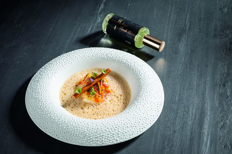Sternekoch Andreas Mayer vom Mayer’s Restaurant in Schloss Prielau in Zell am See hat sich auf diese Duftparfums spezialisiert. Sein wichtigstes Werkzeug ist dabei der Rotationsverdampfer, mit dem er Extrakte und Aromen aus pflanzlichen, organischen und tierischen Bestandteilen gewinnt. Über Jahre hat er Düfte zu Parfums entwickelt und so lange mit verschiedenen Techniken experimentiert, bis er mit dem Ergebnis zufrieden war. Mittlerweile bewahrt er 140 aufwendig produzierte und hocharomatische Essenzen in seinem Duft-Schatzkeller auf. Darunter finden sich Sellerie-, Rote-Beete-, Waldpilz- und Petersil-, aber genauso auch Krustentier-, Gänseleber- und Schweinebauch-Düfte. Diese lässt er vor den Gängen, ähnlich wie Amador, auf einen Papierstreifen sprühen und dem Gast zur Einstimmung unter die Nase halten: „Meine Parfums sind sozusagen der passende Wegweiser zum Gericht und erzeugen eine Duftatmosphäre. Bei einer Variation vom Zitronengras zum Beispiel lasse ich meine Gäste vorher auch an Zitronengras riechen. Sie überlegen dann erst einmal, beschäftigen sich mit dem Geruch, sind nicht abgelenkt vom Geschmack, heiß, kalt oder der Textur des Produkts. So stellt sich das Gehirn schon vor dem Essen viel besser darauf ein und ist sensibilisiert auf das, was kommt. Das wiederum ergibt dann den wesentlich intensiveren Geschmack beim Essen.“