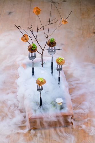 Wenn ich eine Variation vom Steinpilz mache, dann nehme ich den Pilz als Parfum und lasse meine Gäste vor dem Gang schon daran riechen. Die Variationen serviere ich dann auf einem Moosboden und Trockeneis-Nebel, der dazu auch noch mystisch aussieht. Durch die Zugabe von Wasser entsteht ein aromatischer Waldduft. Ich kreiere sozusagen eine Atmosphäre, die den Gast in den Wald entführt, und erweitere durch den erdigen Duftkosmos das Gesamterlebnis. Dabei geht es aber immer nur um den Steinpilz als Grundprodukt, der unbedingt im Vordergrund stehen soll.