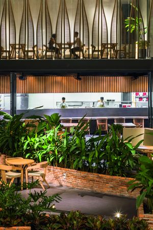 Das Ippudo serviert zwar japanische Ramen-Suppen, liegt aber in einem neuen Stadtviertel von Ho Chi Minh City in Vietnam. Da die Architektur dort die Menschen eher einsperrt und das Klima tropisch ist, haben die Takashi Niwa Architects den über 500 m2 großen Raum offen gelassen, aber mit heimischen Pflanzen unterteilt. Das garantiert Intimität und hilft gegen die schwüle Hitze.