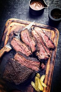 Beef Brisket von der Rinderbrust ist sicher der Klassiker: Das sind drei Teile – das Point, Flat und Burnend –, das wird mit Salz und Pfeffer gewürzt und dann langsam 18 bis 24 Stunden gesmokt. Da darf es keine Schwankungen bei der Temperatur geben, das sollte ständig kontrolliert werden. Dadurch schmilzt das Fett im Fleisch nur sehr langsam und es wird extrem saftig. Das ist die Königsdisziplin beim Rind. Ein echter Longjob!