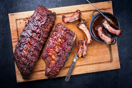 Schweinerippchen mit Carolina Pork Rub einreiben und dann drei Stunden grillen. Anschließend in Alufolie am Grill für zwei Stunden garen, um sie dann wieder eine Stunde auf den Grill zu legen – dazwischen regelmäßig mit einem BBQ-Mob glasieren.
