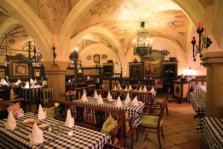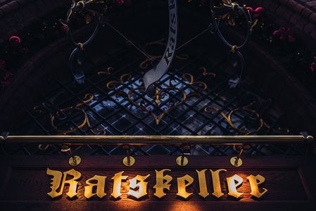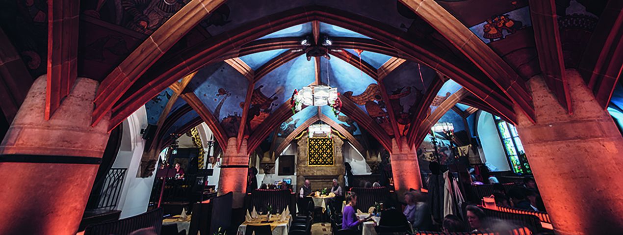 Auch die Mitarbeiter wissen das zu schätzen, sind sie doch zwischen 15 verschiedenen Räumlichkeiten mit insgesamt 1.100 Sitzplätzen im Dienste der Gastfreundschaft unterwegs. Von Mai bis Oktober sind es zusätzlich 180 Sitzplätze im historischen Prunkhof mit seiner eindrucksvollen Fassadenkulisse. Die einzelnen Räume ganz unterschiedlicher Größe haben klingende Namen wie „Ludwig der Erste“, „Arche Noah“, „Alte Küferei“, „Sumpf“ „Himmel und Hölle“ und „Bacchuskeller“. Das „Ensemble“ besticht durch seine Architektur im neugotischen Baustil mit seinen zahlreichen Gemälden, Fresken, Plastiken und gemütlichen Nischen. Optisches Highlight und Schmuckstück des Hauses ist die „Arche Noah“ mit ihren sechs Kreuzgewölben. Sie zieren achtundvierzig beeindruckende Malereien, die das Thema Trinken humoristisch und ermahnend zugleich darstellen. Die Einrichtung des Ratskellers ist dem romantischen Zeitgeist entsprechend im Stile der Gotik des XVI. Jahrhunderts entworfen. Unter den Wiesers erfuhr das historische Interieur lediglich eine behutsame zeitgemäße Auffrischung.