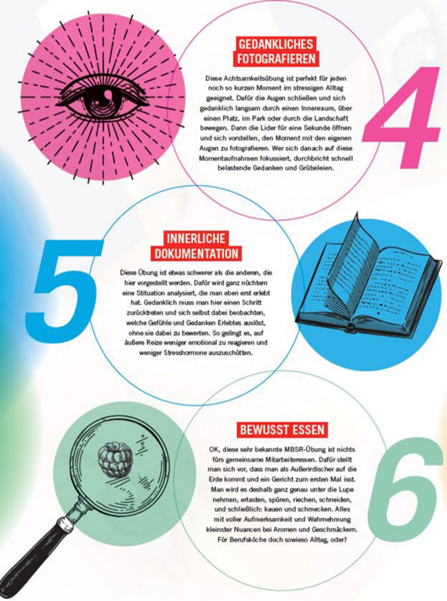 Wesentliches Ziel dabei: Sich und seine Gefühle ohne Wertung von außen zu betrachten. Dadurch soll es gelingen, Reiz und Reaktion zu trennen und so genauer zu verstehen, warum bestimmte Gefühle entstehen und ob sie wirklich so relevant sind. Das hilft enorm dabei, zur Ruhe zu kommen und sich zu entspannen. Unter dem Schlagwort „Achtsamkeitstrainings“ werden für die MBSR-Methoden mittlerweile viele Kurse angeboten. Achtsamkeitsübungen lassen sich aber auch ganz einfach in den Alltag integrieren. So kann jeder selbst ausprobieren, ob Mindfulness Based Stress Reduction dabei helfen kann, das eigene Stresslevel zu senken. Auf den nächsten Seiten stellen wir sechs klassische Beispiele vor.