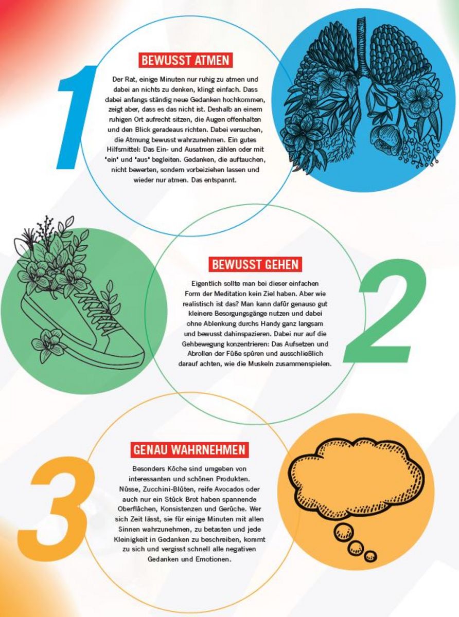 Gastronomie ist Stress pur. Lange hat das die Branche einfach hingenommen. Mit dem Resultat, dass Burn-out und psychische Erschöpfung keine Seltenheit sind. Doch mittlerweile gibt es einige einfache Methoden, Stress besser zu bewältigen. Eine davon ist, mehrmals am Tag für einige Minuten nur im Hier und Jetzt zu leben. FRISCH gibt Tipps, wie das funktionieren kann.