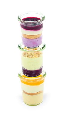 Verzehrfertig sind die Schichtdesserts im Glas nach einer Auftauzeit von drei bis vier Stunden bei Zimmertemperatur oder im Kühlschrank. Danach können sie als Einzelprodukt oder mit anderen Köstlichkeiten auf einem Dessertteller serviert werden. Möglich ist beispielsweise eine Kombination mit frischen Früchten oder mit einem Parfait oder Küchlein. Der Mascarponeschaum auf Kirschen passt Heindl zufolge beispielsweise gut zu einer Schokokuchen-Komponente, da das Glasdessert selbst kein Biskuit enthält. Grundsätzlich gilt: „Der Gastronom hat bei jeder Sorte viel Gestaltungsspielraum beim Ausgarnieren.“