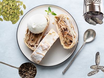 Klassischer Apfelstrudel mit einem Hauch von Indien oder Arabien? „Ja, das passt zusammen“, sagt Lukas M. Walchhofer von Spiceworld und erklärt auch, warum: „Das liegt daran, dass die bei uns bekannten Gewürz-Kombinationen aus Einzelgewürzen bestehen, die in vielen Regionen der Welt verwendet werden.“ Lediglich die Kombinationen sind andernorts anders. Und schließlich ist Apfel auch ein Allerweltsobst. Gewürze wie der süßlich-scharfe Kardamon unterstützen die Süße des Paradiesobstes und runden seine Aromen ab. Dabei muss es nicht immer das Pulver, in dem auch meist die geschmacklosen Fruchtschalen mit vermahlen sind, sein. Verwendet werden kann auch die Saat, die im Mörser zerkleinert wird. Die Samen enthalten ein ätherisches Öl, das Spiceworld zufolge ein würziges, süßlich-scharfes Aroma verleiht. Walchhofer: „Ein Apfelstrudel mit Kardamon und Tahiti-Vanille in unseren Breiten ergibt eine harmonisch spannende Kombination – in einem krossen Strudelteig, vielleicht sogar frittiert neben einem ‚Golden Milk Eis‘, das einen mit bekannten Zutaten verzaubern kann und trotzdem so einfach im Handwerk ist.“