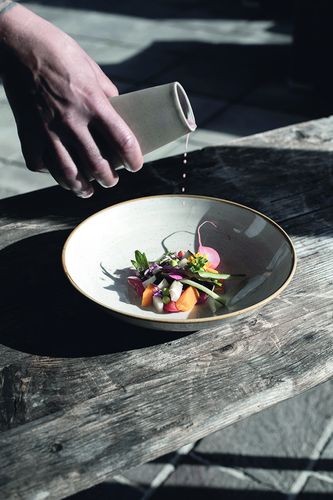 So international Name und Auftritt, so konsequent regional sind die Produkte und Speisen, die Wölkart fünf Tage die Woche im Alleingang von 12 Uhr mittags bis um halb neun abends kredenzt. Sogar den Abwasch macht er selbst. „Die Küche ist sehr klein und ich bin gerne allein“, schmunzelt der Küchenchef. Daneben findet er sogar noch Zeit, auf den Wochenmärkten und bei den Bauern der Region selbst einzukaufen. Gerade in diesen Zeiten sei es besonders wichtig, eng mit regionalen Lieferanten zusammenzuarbeiten, ist Wölkart überzeugt: „Durch die enge Zusammenarbeit kann ich immer das bieten, was gerade frisch zur Verfügung steht.“ Außerdem durchstreift der ambitionierte Koch gerne die Wälder auf der Suche nach kulinarisch verwertbaren Schätzen. „Ich bin ein Naturmensch“, meint er knapp. Und so kombiniert er beispielsweise den Ausseerland-Saibling mit Zapfen-Flechten-Püree. Die Zapfen und Flechten werden dafür in Wasser eingelegt und ziehen dann bis zu drei Monate in der Sonne. In einem Auszug dieser Flüssigkeit werden anschließend die Kartoffeln fürs Püree gekocht und nehmen so ihren herrlich dezenten Geschmack an. Selbst das Heu der Bauern zaubert in Wölkarts Küche den Geschmack der Region an die Gaumen der Gäste. Er stellt daraus Tee für Fonds und Suppen her: Für seine Heusuppe brennt er den Tee ein, kocht ihn mit frischem Gemüse auf und verfeinert ihn mit Sahne und Butter. Die außergewöhnliche Suppe kommt laut Küchenchef „brutal gut“ an. „Ich wende viele Verarbeitungsmethoden so an, wie ich sie von der Großeltern-Generation kenne“, erzählt der Steirer, der in einem Gastbetrieb aufgewachsen ist: „Dabei probiere ich gerne ungewöhnliche Zutaten aus und verarbeite sie auf traditionelle Weise. In der Natur ist so viel zu entdecken, was man verkochen kann.“ Entsprechend dieser Philosophie zählt für ihn auch das Fermentieren von Obst, Gemüse und was er sonst noch findet sowie das Räuchern von Fisch zum persönlichen Must-do.