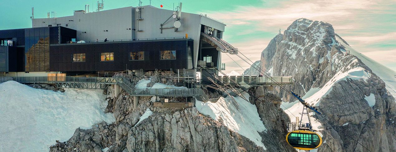 Auf 2.700 Metern thront dér auf drei Seiten mit PV-Modulen verkleidete „Enengiskistall" auf dem Dachsteinmassiv.