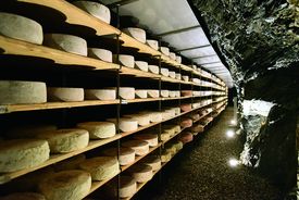 Im 40 Meter langen Natursteinstollen aus dem 2. Weltkrieg herrschen ideale Reifebedingungen – vor allem für Hartkäse.