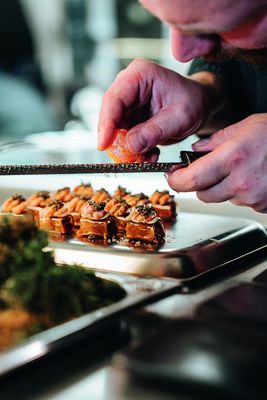 Innerhalb eines Jahres nach Eröffnung mit drei Hauben gekrönt zu werden, hatte Küchenchef und Kammer5-Gründer Wolfgang Wohlschlager weder geplant noch vorhergesehen. Es hat sich ergeben, meint er: „Ich bin eher der Bodenständige, der sagt, machen wir mal. Unser Küchenteam ist sehr motiviert und hat mit seinen Ideen und seinem Engagement das Niveau von Mal zu Mal gesteigert.“ Nach beruflichen Stationen in Tophäusern wie dem Hotel Palace in Luzern, im Gstaad Palace und im Sporthotel Lorünser in Zürs am Arlberg genießt Wohlschlager es aber trotzdem, nun selbst eine heiße Adresse für erlesenen Genuss geschaffen zu haben. Der dadurch erhöhte Stress-Level stört ihn nicht – im Gegenteil: „Der gehört zum Beruf. Mir taugt das“, lacht der Innviertler, der von sich sagt‚ „vor Mut zu kochen“. Dabei wird in der Kammer5 laut Wohlschlager nichts neu erfunden, sondern das Althergebrachte auf ein hohes Qualitätsniveau gehoben und da und dort neu interpretiert. Mit anderen Worten: Bodenständig Innviertlerisches mit französischem Touch. Bestes Beispiel dafür, das Innviertler Surf & Turf: Beste heimische Garnelen auf ausgelöstem Ripperl-Fleisch vom oberösterreichischen Duroc Schwein, begleitet von feinem Mangosalat. „Wir wissen, woher unsere Lieferanten kommen, und wir wissen, woher wir kommen – so weiß auch jeder, was er bekommt“, bringt es der Haubenkoch auf den Punkt. Dieser Klarheit ist es auch zu verdanken, dass das Projekt Kammer5 am Leitner Gut überhaupt realisiert wurde und als Newcomer kulinarisch reüssiert.
