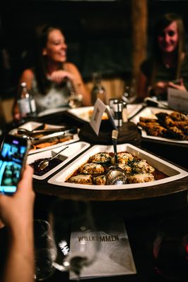 Ein genauso schönes Konzept haben sich Wohlschlager und Enkner für den großen Leitner Stadel überlegt. Hier bewirten sie die 250 Gäste auf runden Tischen für jeweils 10 Personen. „Wir haben dafür extra drehbare Wagenräder anfertigen lassen, in die spezielle Porzellaneinsätze eingepasst sind, in denen die Gerichte serviert werden. Die Gäste können sich so à la Family-Style-Dining selbst bedienen,“ erklärt der Kammer5-Chef und reimt lachend: „Nicht lange am Buffet stehen, einfach nur das Radl drehen.“
