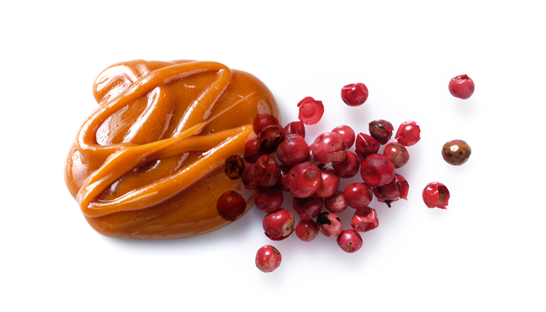 Roter Pfeffer weist viele unterschiedliche Geschmacksnuancen auf, die von Holz bis blumige Aromen reichen – allerdings dominiert die Schärfe klar am Gaumen. Der Geschmack von Karamell bringt zum Teil blumige Aromen in die Paarung und neutralisiert die Bitterstoffe im Pfeffer. In der Kombination mit Pfeffer wirkt das Karamell weniger süß, Schärfe gibt der Kombination insgesamt mehr Geschmackstiefe.