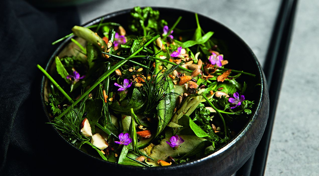 KRÄUTER WIE MINZE, KORIANDERGRÜN, PETERSILIE UND ESTRAGON WERDEN HIER IM TEAM MIT FENCHEL, GURKE UND EINEM WILDEN KERNE-MIX ZU TISCHKUNST, DIE AUCH NOCH DEN SOMMER AUF DIE ZUNGE HOLT.
