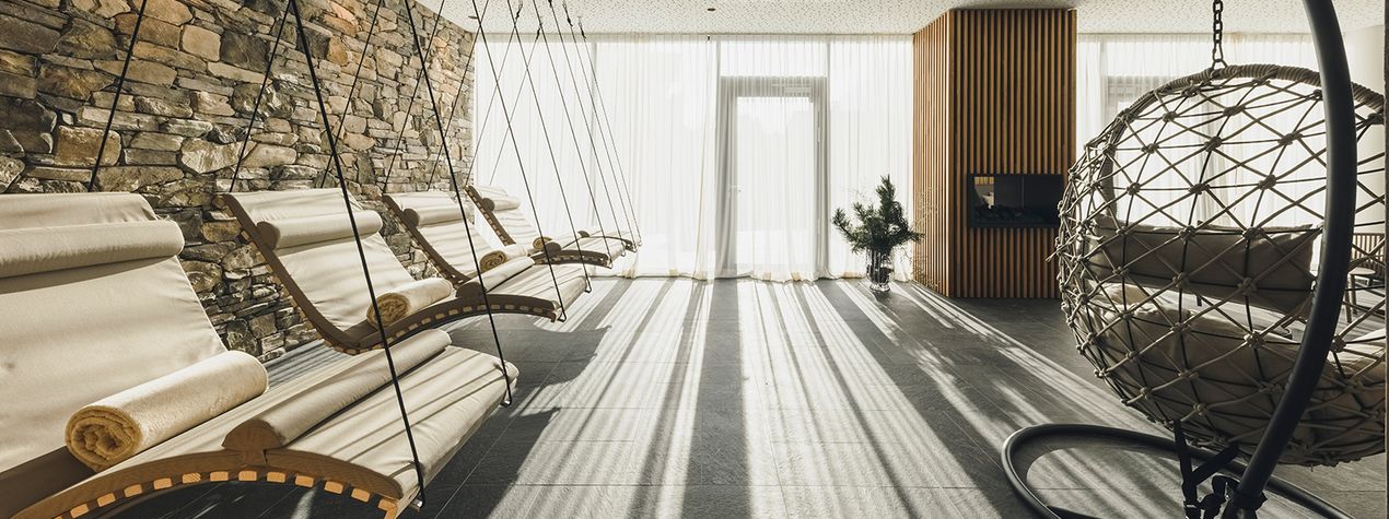 Trotz der vielen Besonderheiten im Interior Design, die unweigerlich den Blick auf sich ziehen, hat man es bei der Neugestaltung des Hotels verstanden, auch die grandiose Naturkulisse geschickt miteinzubeziehen. Große Glasflächen bringen einerseits viel natürliches Licht ins Innere und geben andererseits den Blick auf die faszinierende Bergwelt frei. „Bei uns verschwimmt das Innen mit dem Außen“, sagt Reininger, der das Hotel gerne mit einem Vierkanthof vergleicht: „Von außen wirkt das Gebäude eher unscheinbar, aber wenn man die Lobby betritt, wird einem ein unbeschreiblicher Aus- und Weitblick dargeboten. Viele Gäste sind da echt baff.“ Das Eingangsfoyer mit seinen riesigen Fensterfronten gibt den Blick nicht nur auf die umliegende Bergwelt frei, sondern auch auf den gartenähnlichen Innenhof mit großem Panorama-Outdoorpool. „Bei diesem Anblick fällt bei vielen Gästen meist schon eine ordentliche Portion Alltagsstress ab“, lacht der Hoteldirektor. Eine großzügige und offene Raumgestaltung wurde auch bei den Hotelzimmern im neuen Trakt gewählt: Es gibt dort ausschließlich Junior-Suiten.