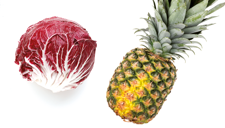 Der Radicchio hat einen überdurchschnittlich hohen Anteil an Bitterstoffen, die man durch kurzes Waschen in lauwarmem Wasser stark reduzieren kann. Dadurch wird er bekömmlicher und eignet sich besser für diese spannende Kombination. Der hohe Zuckeranteil der reifen Ananas neutralisiert die restlichen Bitterstoffe des Radicchios, am Gaumen bleiben die Süße der Frucht und die leichte Schärfe des Salates.