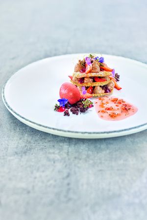 Die vegane Schokomousse hat es Martin Kinast am meisten angetan. Kaum ein Unterschied zum Original sei zu schmecken. Damit ist sie eine ideale vegane Alternative für die Dessertkarte. Hierzu wird sie auf aufgebackenen, veganen Wan-Tan-Teig zusammen mit in Zitronenthymian marinierten Erdbeeren geschichtet. Dazu gibt es ein klassisches Erdbeersorbet, ein paar Tupfen von mit Agar Agar hergestelltem Erdbeergel, etwas veganen Schokocrunch und einen leichten Sud auf Basis von Holundersaft mit etwas Zitronen, einem Schuss Weißwein und kleingeschnittenen Erdbeer-Stückchen.