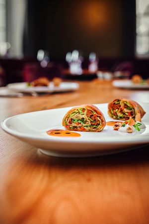 Fleisch- und Krautstrudel eignen sich generell besonders gut für die Verwendung von veganem Faschierten. Es lässt beim schonenden Anbraten wenig Saft und durchweicht die Strudelblätter dadurch kaum. Kombiniert werden bei diesem Gericht Frühkraut und Zwiebeln mit einem Spiegel aus Paprikasauce, einem leichten veganen Joghurt-Dip mit gerösteten Haselnüssen für den Crunch und etwas Bärlauchöl. Martin Kinast arbeitet beim Kochen auch gerne mit einem Schuss Soja für die Extraportion Umami-Geschmack. Ein Gericht, das manchem veganen Gast die Freudentränen in die Augen treten lassen wird.