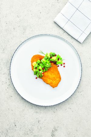 Dank Erbsenprotein wird aus dem Wiener im Handumdrehen das vegane „Viener“. Da es vorgegart ist, sollte man nicht zu lange und zu heiß frittieren. Dann passt die Panade perfekt und Fleischstruktur wie Biss sind von Hühnerfleisch kaum zu unterscheiden. Martin Kinast kombiniert dazu glasierten Spargel und Erbsen. Spannend ist auch die Mayonnaise, bei der ein Teelöffel Senf mit Kichererbsenwasser und einem Kräuteröl auf Sonnenblumenöl-Basis aufgezogen wird. Dann noch garnieren und fertig ist die perfekte vegane Alternative zum Standardschnitzel. Wer will, kann dazu ein Hafermilch-Kartoffelpürree servieren.