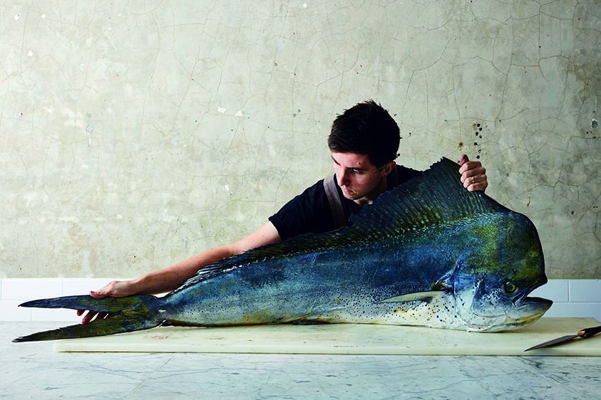 Beim Fleisch ist es längst ein Trend: Köche überall auf der Welt verwenden nicht mehr ausschließlich die besten Stücke, sondern versuchen aus bisher vernachlässigten Schnitten und Innereien das Beste herauszuholen. Der junge Starkoch Josh Niland wendet diese Herangehensweise nun auch auf Fisch an. Zum Beispiel pökelt er die Leber von Königsdorschen oder testet, was mit dem Samen von Clamari kulinarisch möglich ist. Auch Haut, Herz und Blut der Fische werden in seiner Küche nicht weggeworfen. Mit Letzterem stellt sein Team etwa eine Fisch-Blutwurst her. Selbst langes Dry-Agen ist kein Tabu. Einen weißen Thun lässt Niland zum Beispiel für 41 Tage in einer speziellen Kühlkammer vor einem Ventilator hängen. „Der Fisch hat danach die komplette Feuchtigkeit verloren und man schmeckt sein echtes Aroma“, ist er von der Technik begeistert. Derzeit gibt es wohl niemanden, der sich Vergleichbares traut.