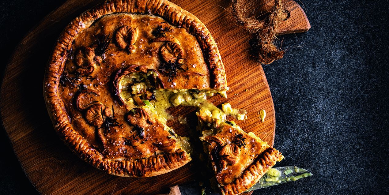 - Das Eigelb mit etwas Wasser aufschlagen und damit den Teigdeckel bestreichen. Dann den Deckel mit Rosmarin und Thymian verzieren. Nun die Pfanne in das Big Green Egg stellen und bei indirekter Hitze mit kaltem Pizzastein bei 180 Grad 30 bis 40 Minuten goldbraun backen, bis sie gar ist.