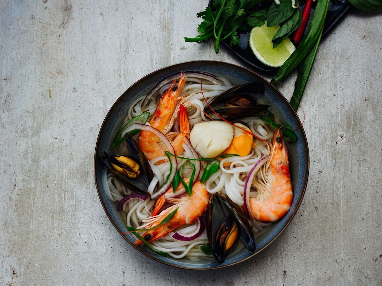 Eine Pho mit Meeresfrüchten. Ein etwas ungewöhnliches Rezept, aber im Ergebnis eine wunderbar leichte Brühe mit rotleuchtenden Garnelen, zartem Jakobsmuschelfleisch und aromatischen Miesmuscheln. Zusammen mit seidenweichen Pho-Nudeln und Kräutern eine delikate Ergänzung der klassischen Pho Rezepte.