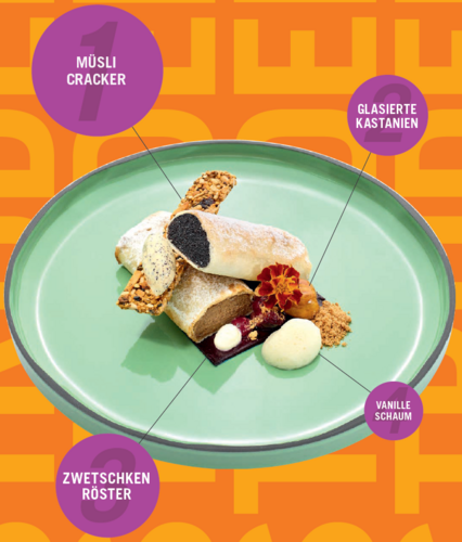 Nachtisch: Mit Müslikracker, glasierten Kastanien, Zwetschkenröster und Vanilleschaum.