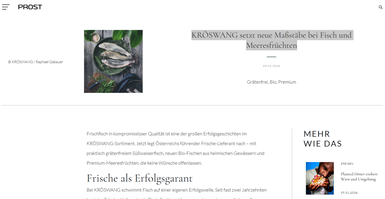 Frischfisch in kompromissloser Qualität ist eine der großen Erfolgsgeschichten im KRÖSWANG-Sortiment. Jetzt legt Österreichs führender Frische-Lieferant nach – mit praktisch grätenfreiem Süßwasserfisch, neuen Bio-Fischen aus heimischen Gewässern und Premium-Meeresfrüchten, die keine Wünsche offenlassen.