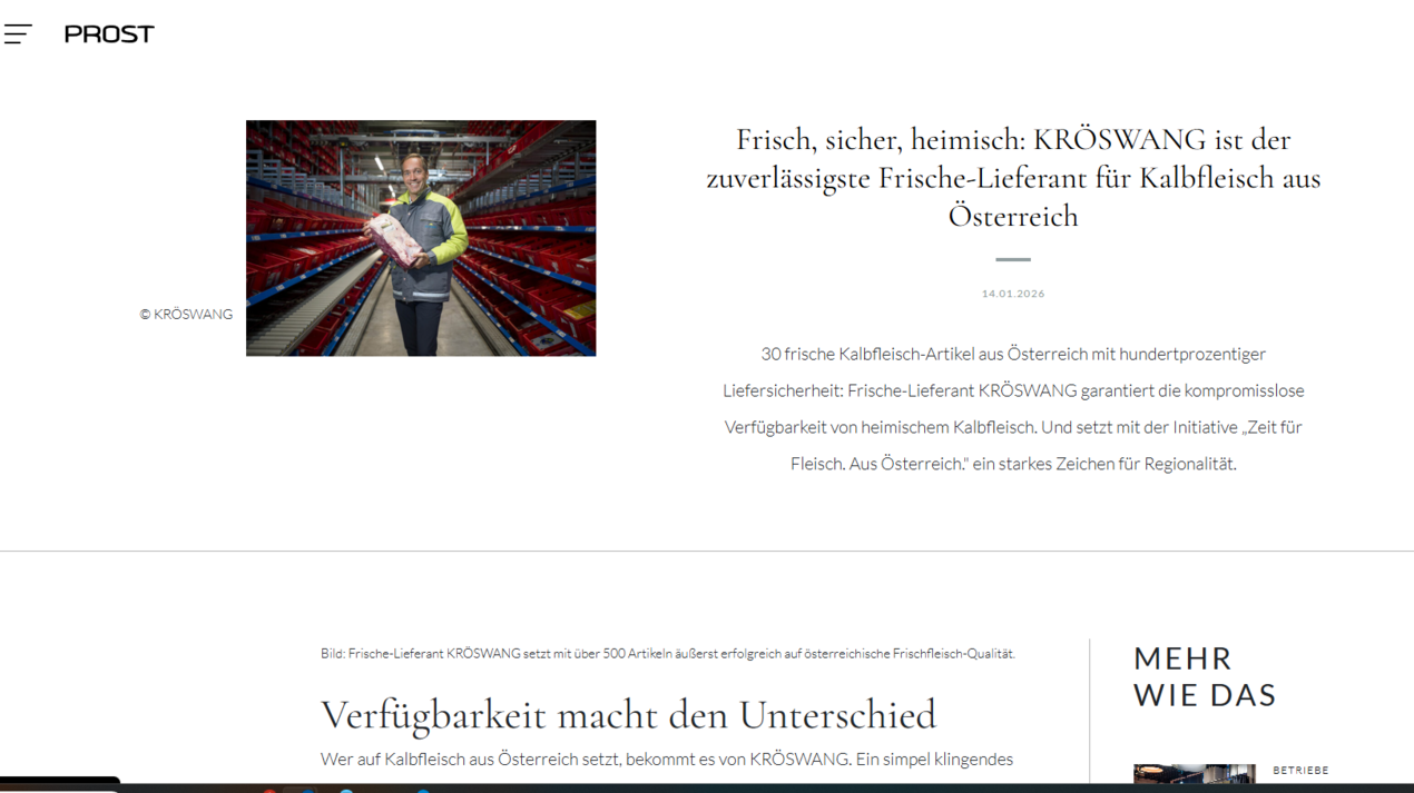 30 frische Kalbfleisch-Artikel aus Österreich mit hundertprozentiger Liefersicherheit: Frische-Lieferant KRÖSWANG garantiert die kompromisslose Verfügbarkeit von heimischem Kalbfleisch. Und setzt mit der Initiative „Zeit für Fleisch. Aus Österreich." ein starkes Zeichen für Regionalität.